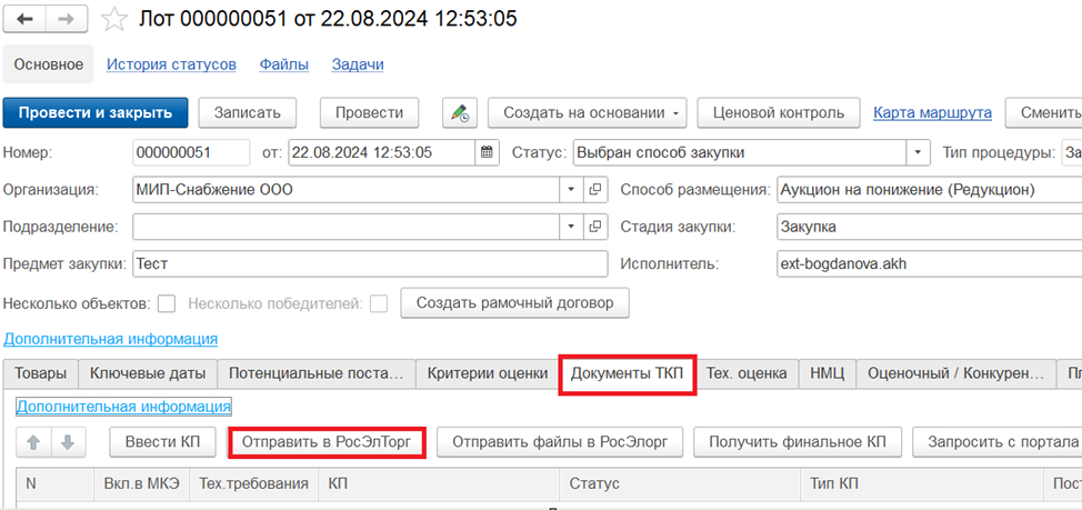 Пользователь заполняет документ «Закупочная процедура» в ЦПБУП, после чего нажимает кнопку «Отправить в Росэлторг».