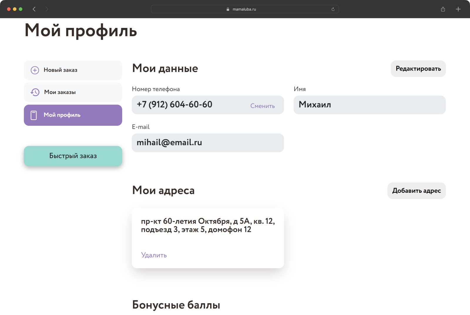 Сделать заказ возможно через личный кабинет, в ЛК можно увидеть заказы, которые были оформлены и выполнены ранее. В разделе «Мой профиль» пользователь вносит собственные данные, настраивает уведомления, которые хотел бы получать от компании. Также в личном кабинете расположена бонусная система «Мама Бонус», пользователь видит на счете неизрасходованные бонусные баллы.5. Бонусная система