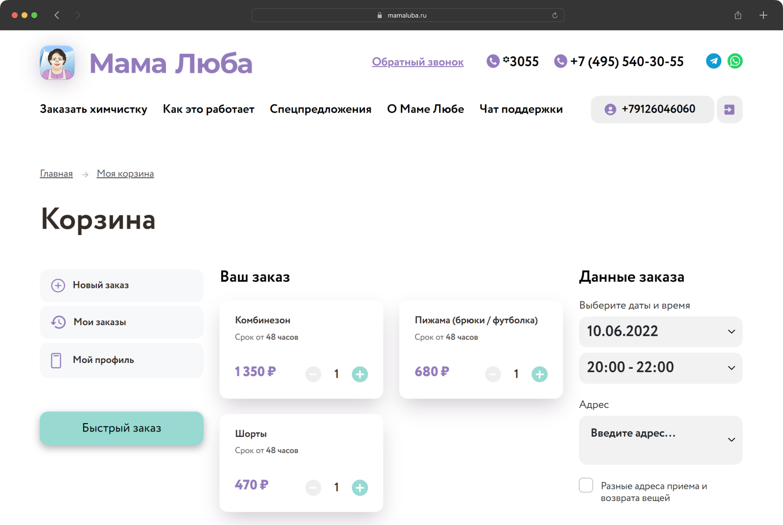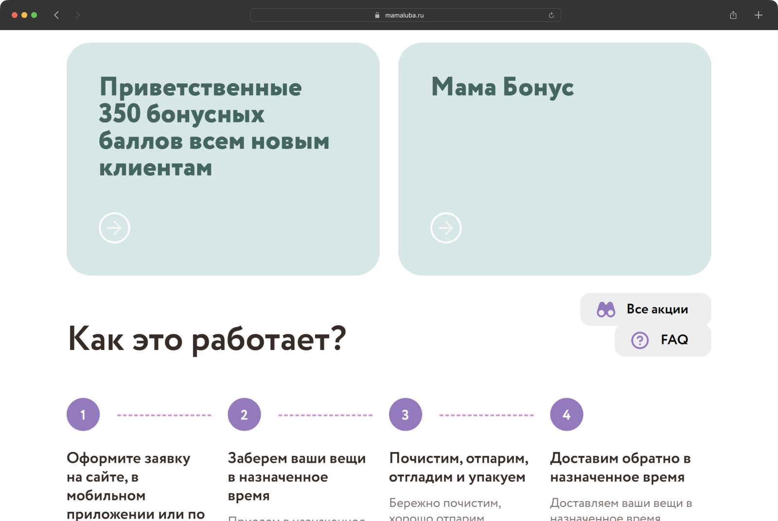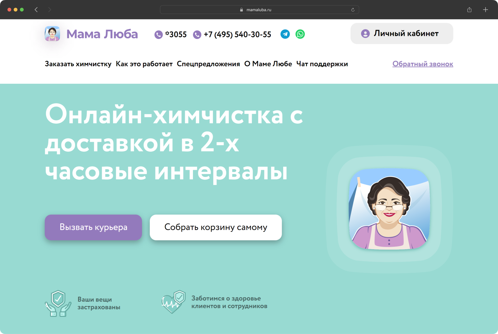 Профессиональная онлайн химчистка “Мама Люба” сделали основной идей практически бесконтактную систему работы, где взаимодействие исполнителя с клиентом происходит только на этапе забора и выдачи заказа курьером, в остальном все контакты минимизированы. Акцент сделан на скорости обработки заказов и простоту использования платформы, что экономит время заказчиков на услуги химчистки.