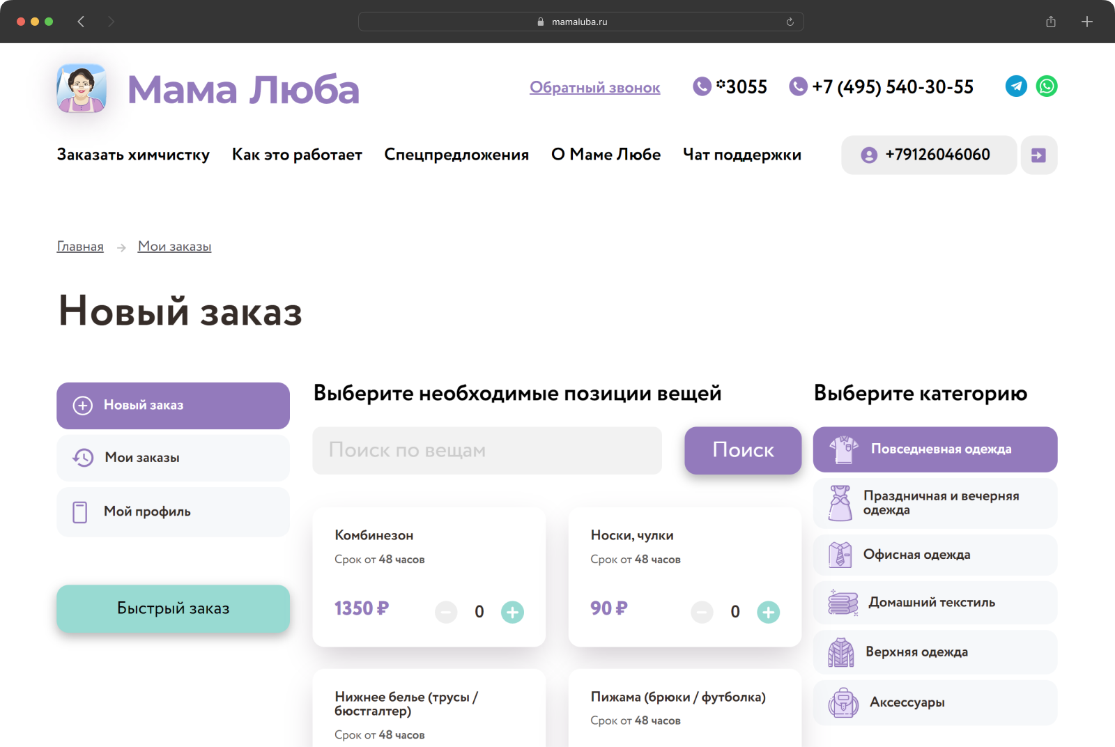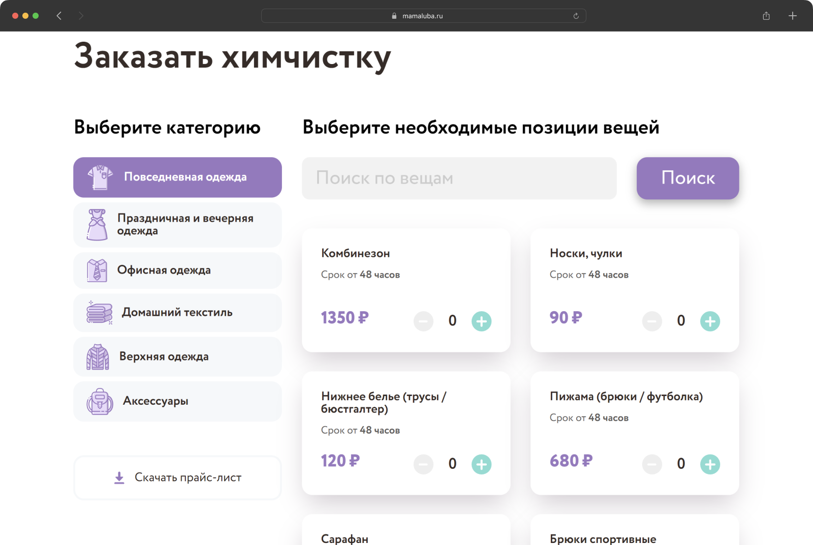 Возможность пользователю самостоятельно выбрать позиции для заказа из представленных категорий, оценить стоимость каждого изделия для химчистки, положить в корзину необходимое количество предметов и увидеть итоговую стоимость. При необходимости в строке поиска найти нужную позицию. Оформить заказ.2. Вызов курьера